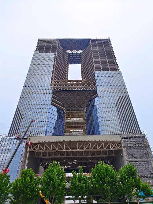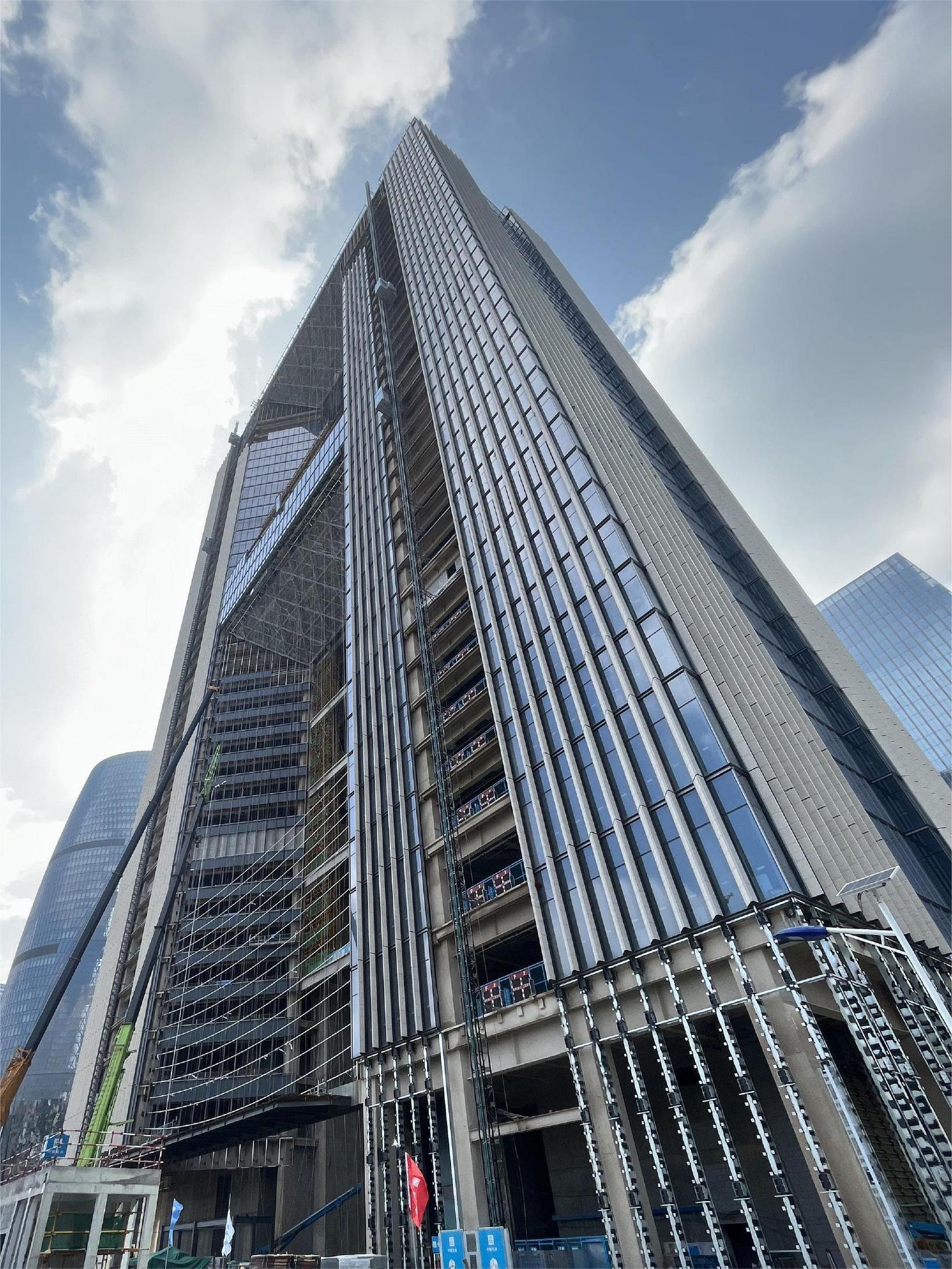 該斜面幕墻區(qū)域,全手工焊接,為了保證建筑外立面的平整度,要求產(chǎn)品在工廠內(nèi)加工精度誤差不能超過2mm,經(jīng)過全員共同努力,緊跟大廈主體結(jié)構(gòu)同步施工,已經(jīng)順利配合外墻裝飾材料的供貨20000余平方。